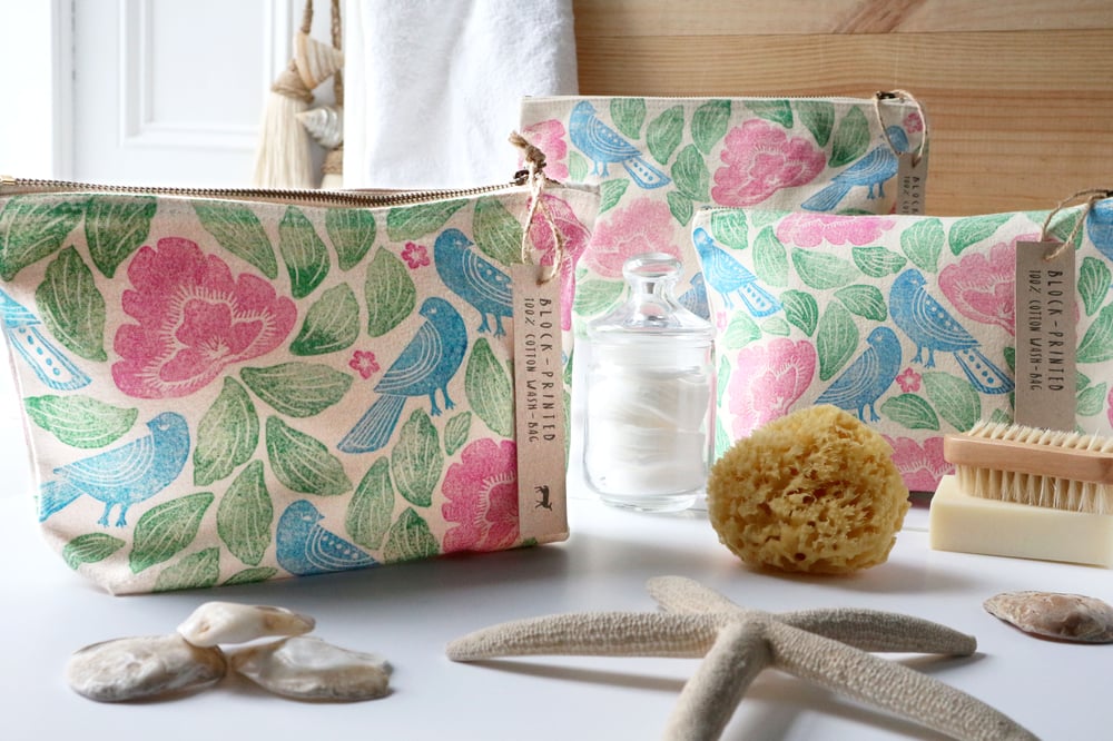 Folk Art Cotton Canvas Cosmetic Bag, Limited Edition Block-Print